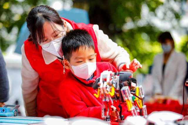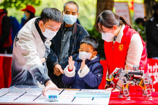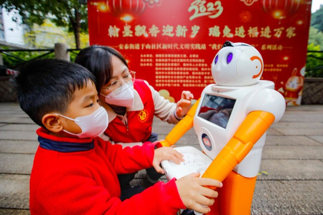 1月11日,在福建省福州市鼓楼区安泰街道鳌峰坊小广场,小学生在社区志愿者陪同下,体验机器人带来的乐趣。谢贵明 摄