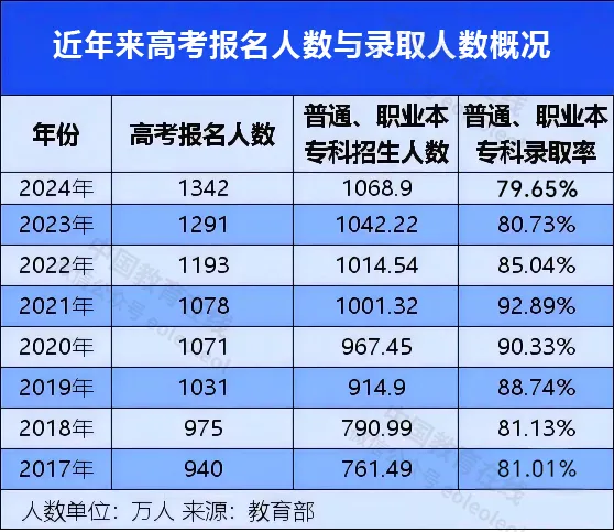 根据教育部公布的数据,2024年我国高考报名人数1342万人,全国普通本科、职业本科、专科招生人数为1068.9万人,录取率近80%。