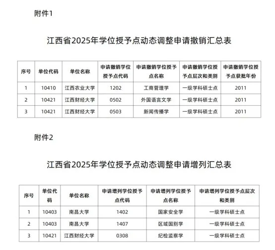 近日,江西省教育厅发布《关于2025年江西省学位授予点动态调整撤销和增列的公示》。