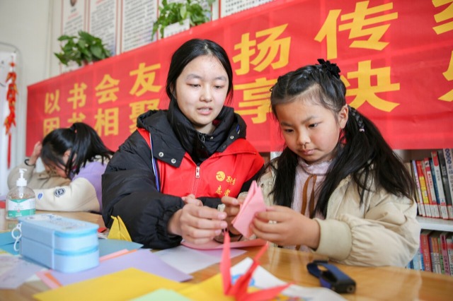 1月29日,在江苏省如皋市城南街道左邬村农家书屋内,志愿者正在指导村里的儿童绘画和手工折纸。寒假期间,当地充分依托农家书屋阵地,积极组织村干部和返乡大学生,为孩子们开展绘画、手工制作、趣味游戏等公益课堂,丰富假期生活。通讯员 徐慧 摄