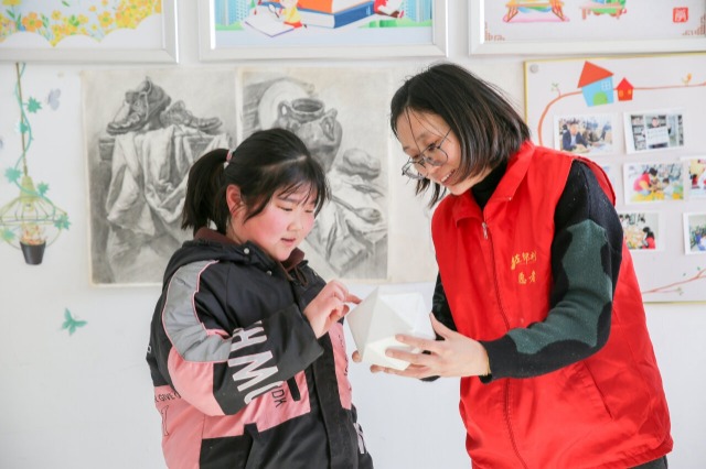 志愿者正在给小朋友讲初级几何结构素描。通讯员 徐慧 摄