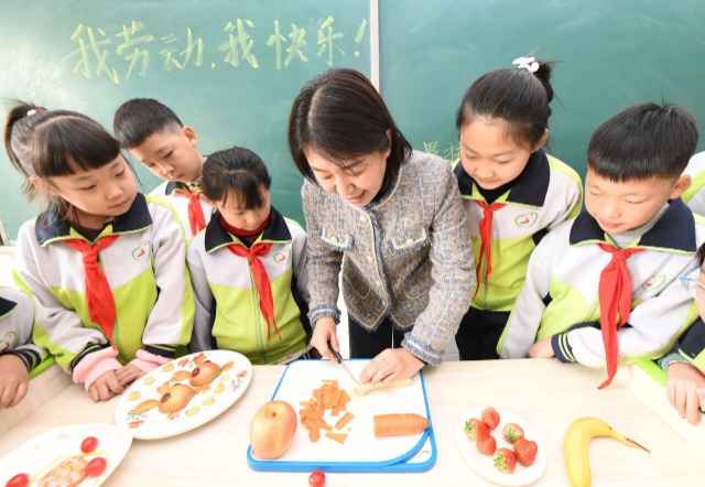 2月7日,在河北省石家庄新乐市民生街小学三年级(1)班,马红霞老师在劳动课上教孩子们制作水果拼盘。贾敏杰 摄