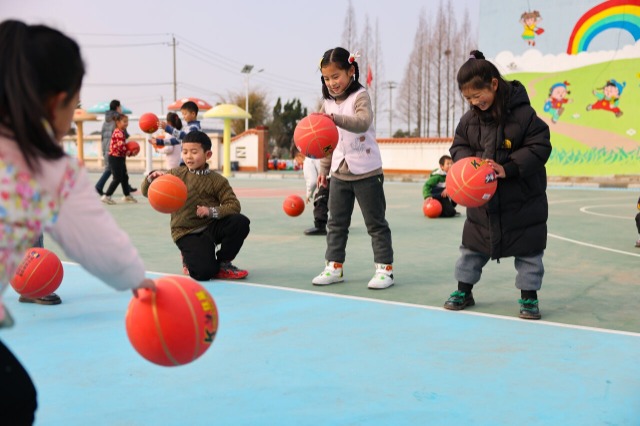 2月14日,在湖北省襄阳市樊城区牛首镇张湖村教学点,小学二年级的学生们在新修建的篮球场上练习拍球。据了解,为促进农村微小型学校优质发展,湖北省襄阳市樊城区在部分条件成熟的农村教学点开设小学一、二年级的基础上,增设三年学前教育,实行“3+2”幼小衔接五年制办学模式,满足群众就近入学、入园享受优质教育资源的迫切需求。(通讯员 付晓方 摄)