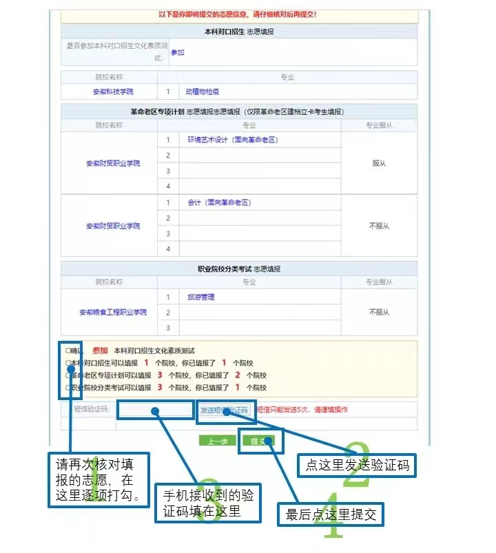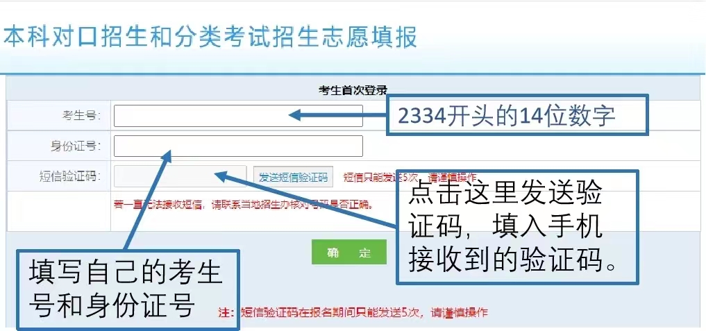3.首次登录和志愿提交时均会发送短信验证码,如遇无法接收短信验证码、遗忘考生号等问题,请联系报名点或当地招办。