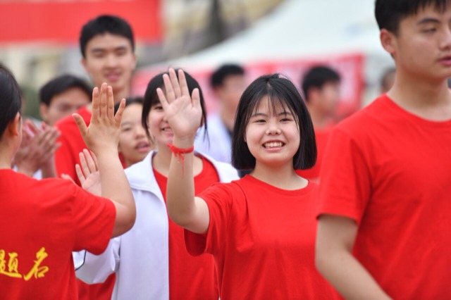 6月7日,2023年全国高考正式拉开帷幕。图为考生在进入贵州省黄平民族中学考点前与送考老师击掌。中国教育报-中国教育新闻网通讯员 梁文 摄