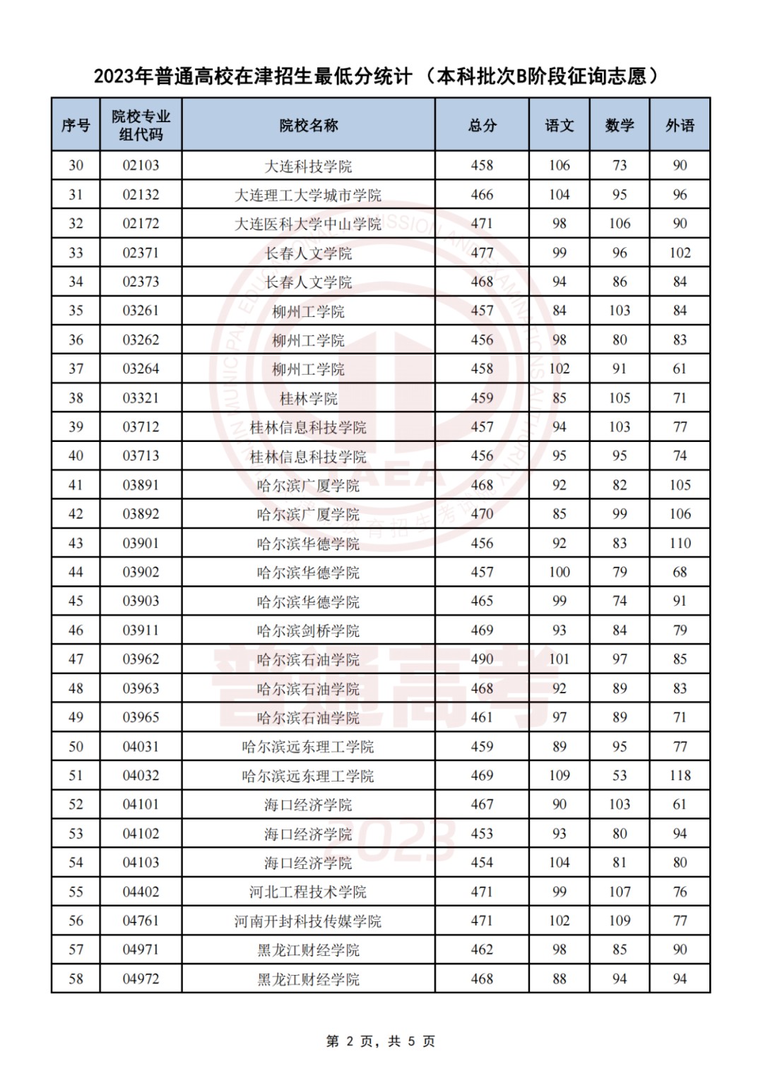 2023年普通高校在津招生最低分统计(本科批次B阶段征询志愿)