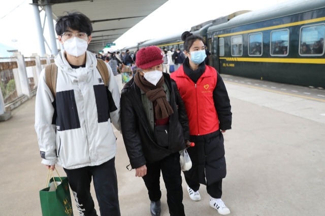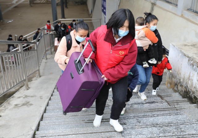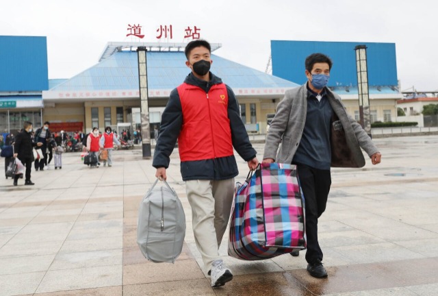 春运以来,湖南省永州市道县青年志愿者们活跃在车站、码头,为旅客免费提供口罩、热姜茶、咨询服务和提行李等志愿服务,给旅客旅途注入丝丝温暖。(中国教育报-中国教育新闻网 通讯员 何红福 摄)