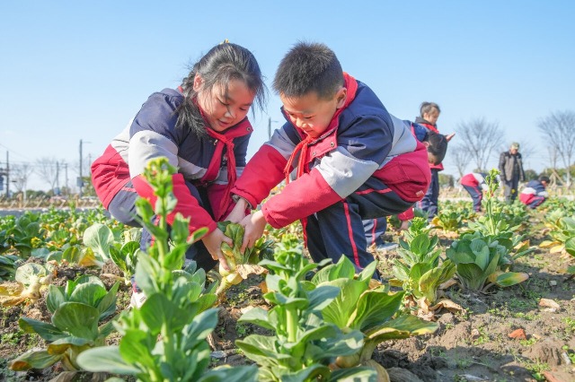 新学期伊始,浙江省湖州市德清县禹越镇徐家庄中心小学开展劳动实践教育活动,学生们体验蔬菜采收、挖土、浇水等特色劳动课程,让学生们感受劳动的艰辛和丰收的快乐,培养学生勤俭节约、热爱劳动的好习惯。(通讯员 王树成 摄)