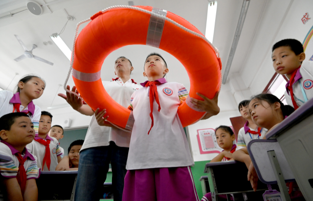 志愿者为学生们讲解救生圈的使用方法 郝群英 摄
