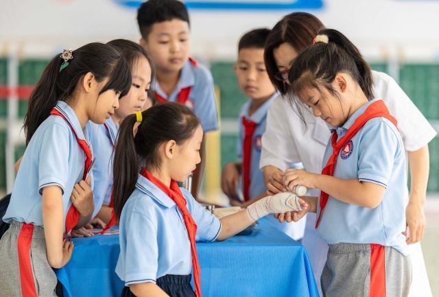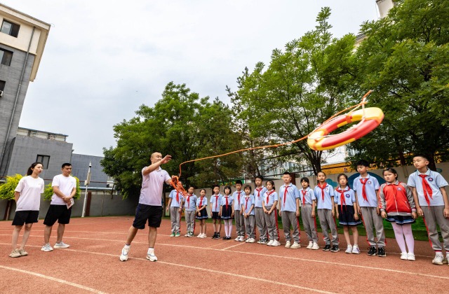 暑假来临,内蒙古呼和浩特市玉泉区通顺街小学开展以“暑期防溺水 安全记心间”为主题的安全教育活动,学校邀请内蒙古游泳救生协会的志愿者走进校园,通过宣讲防溺水常识、教授安全急救技能、开展实例警示教育等形式,提升孩子们防溺水安全意识和溺水自救能力。(中国教育报-中国教育新闻网 通讯员 丁根厚 摄)