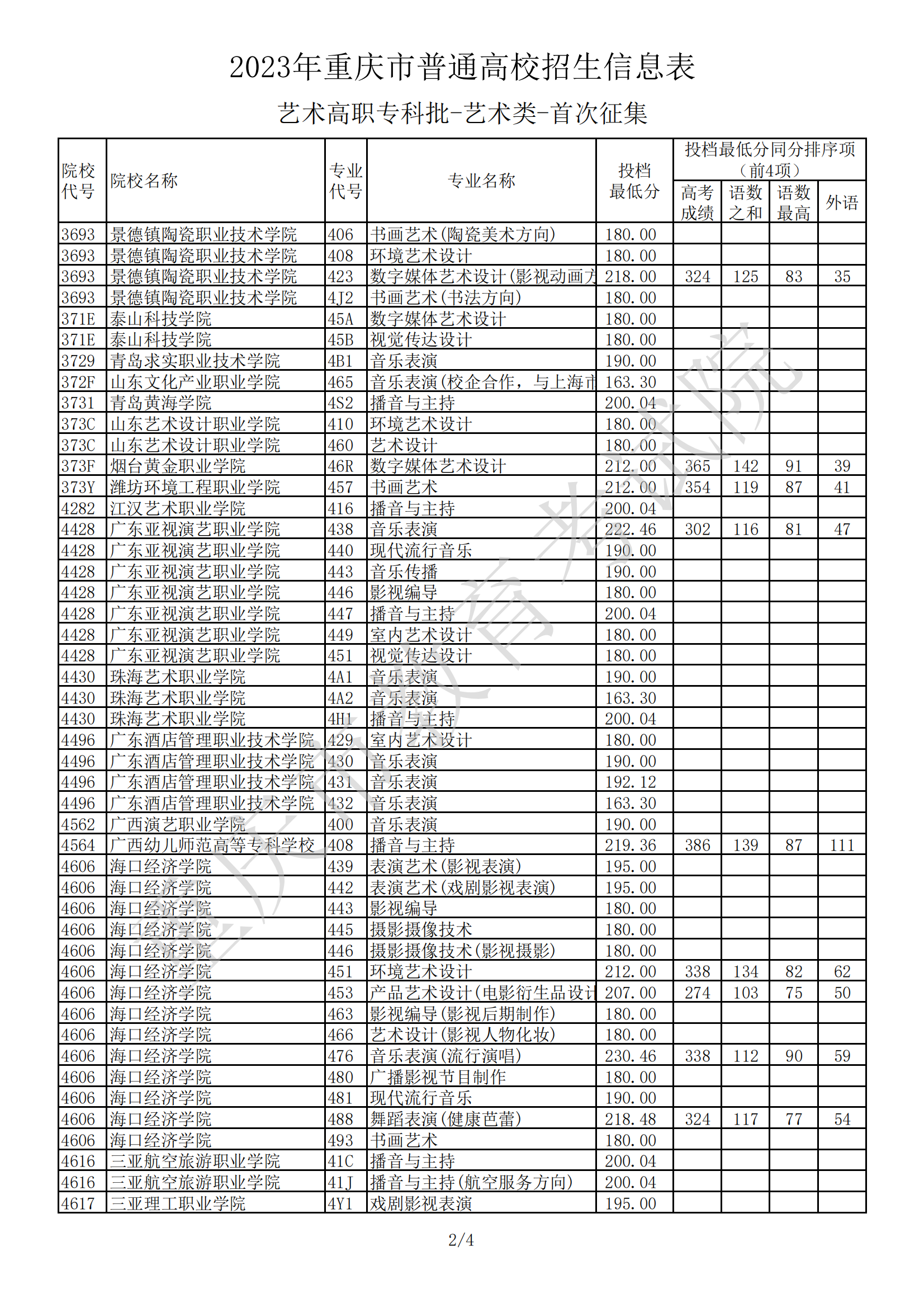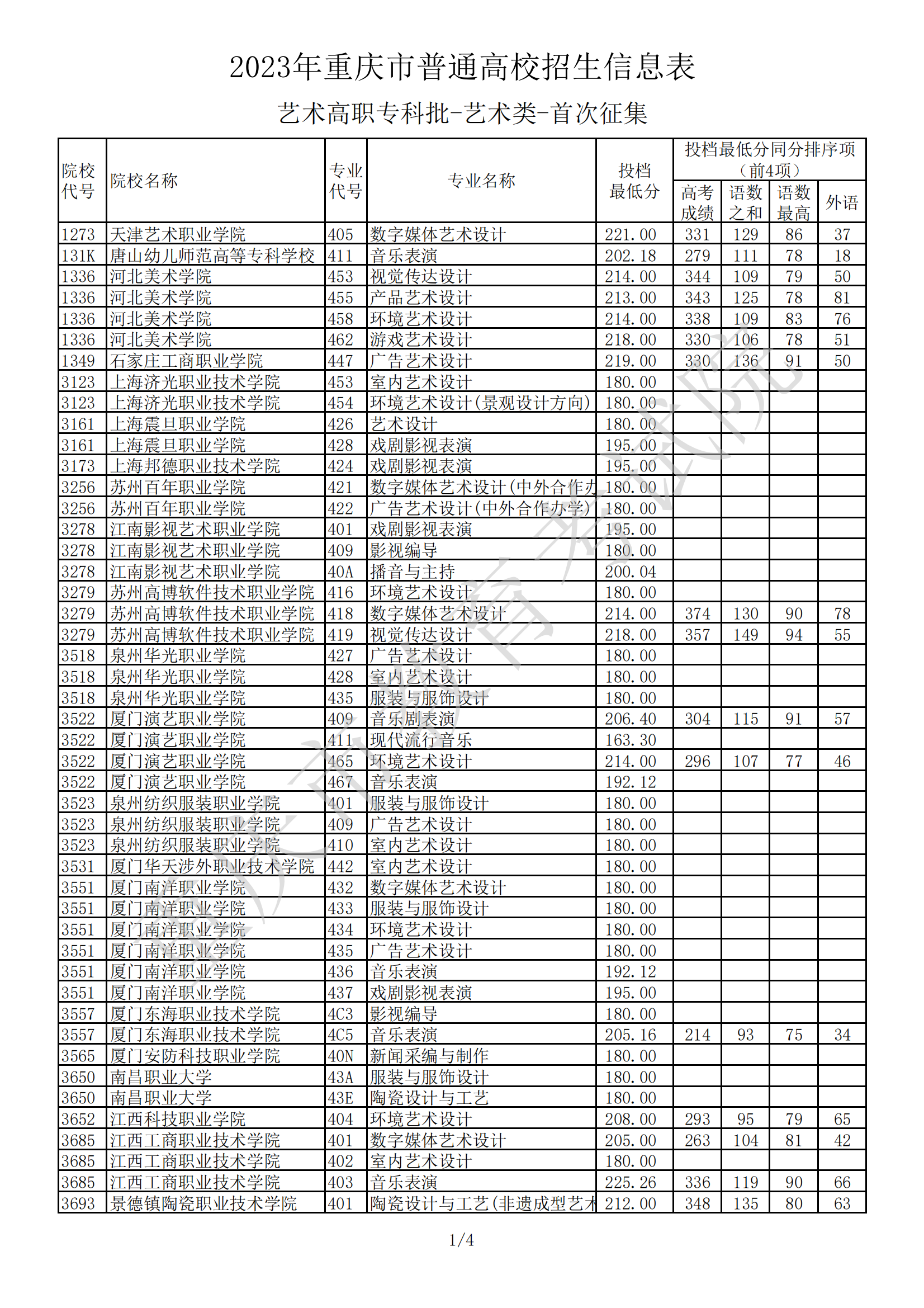 2023年重庆市普通高校招生信息表(艺术高职专科批-艺术类-首次征集) 【#艺术高考# 导语】®第一考试网从重庆招考了解到,2023年重庆市普通高校招生信息表(艺术高职专科批-艺术类-首次征集)已公布,详细内容如下:...