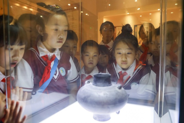 学生们参观李沧区博物馆陈列的龙山文化黑陶罍 张鹰 摄