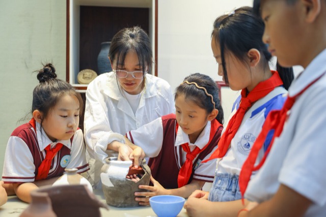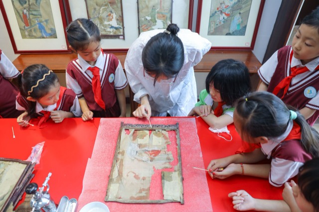 7月25日,山东省青岛市第二实验小学学生走进李沧区新时代文明实践中心,开展“文物无言 文明有声”主题活动,孩子们通过参观博物馆,体验文物修复、拓片等活动,近距离“触摸”历史,激发对历史的兴趣,乐享暑假生活。(中国教育报-中国教育新闻网 通讯员 张鹰 摄)